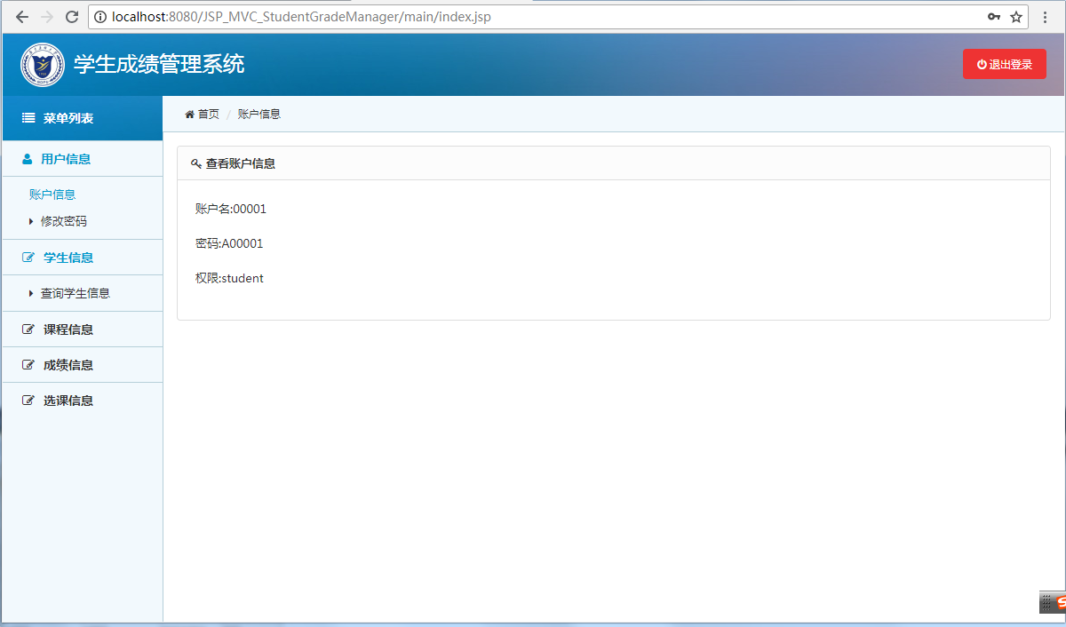 本程序是使用JSP+Servlet+Mysql实现学生选课成绩管理系统,包含管理员、老师、学生三种角色,主要包含个人账户信息查看、修改密码、学生信息管理、老师信息管理、课程信息管理、选课信息管理及成绩信息管理,功能完整,代码简介,界面美观,适合学习及课设使用,可以进行二次定制开发