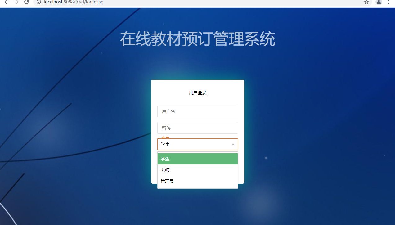 本项目为基于SSM实现的在线教材预约管理系统,分为教师、学生、管理员等三种角色