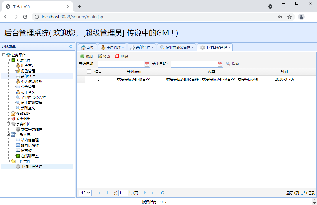 使用SSM+mysql实现企业内部管理沟通系统是实现企业内部员工信息管理及交流的系统。典型的企业内部信息系统一般都应提供诸如员工信息查询、管理维护等功能,同时也应该提供企业内部公告功能,以便于在企业内部及时迅速地传递信息