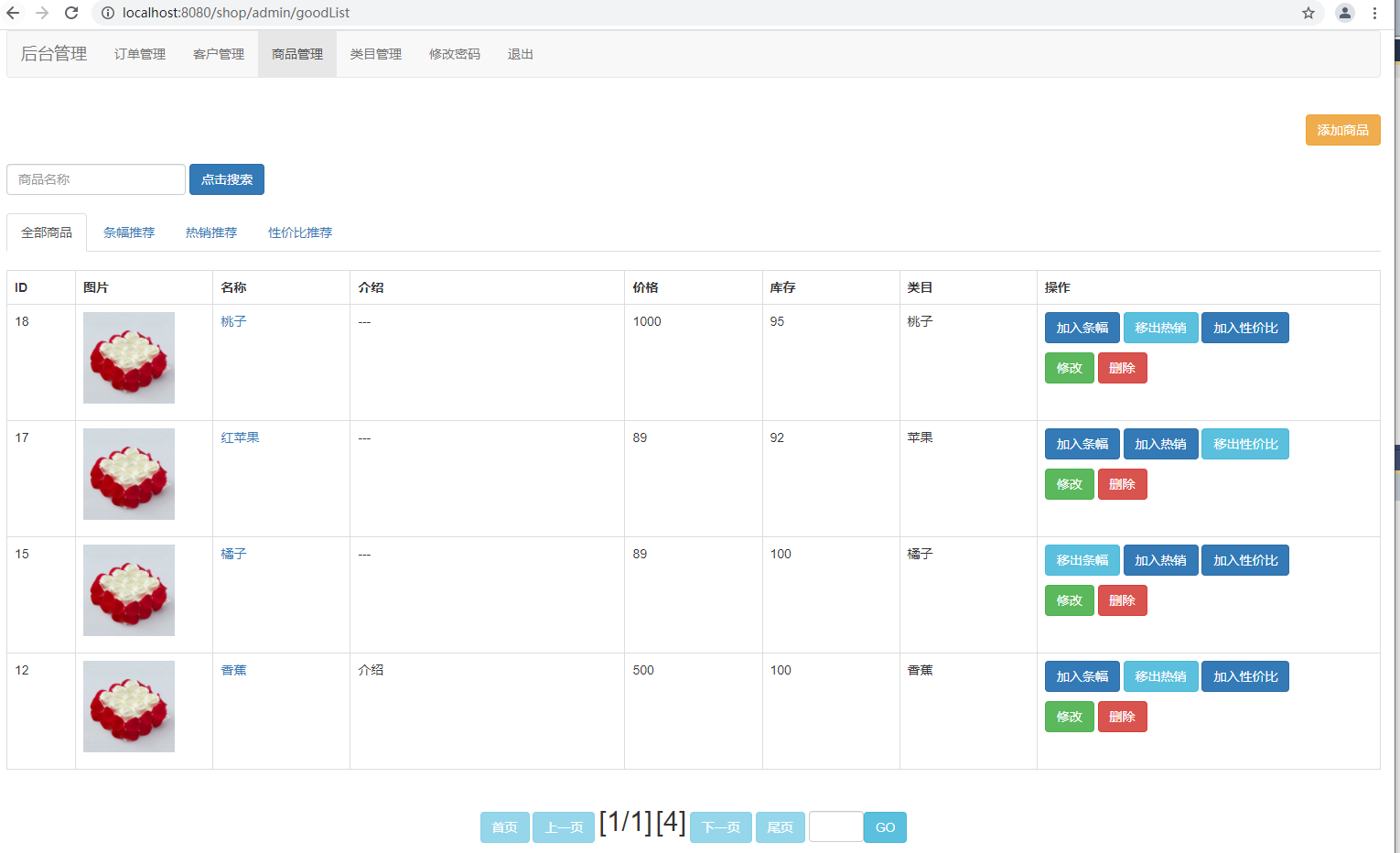 管理员登录管理后台可以针对水果分类及水果信息进行管理,可以管理顾客信息及订单信息
