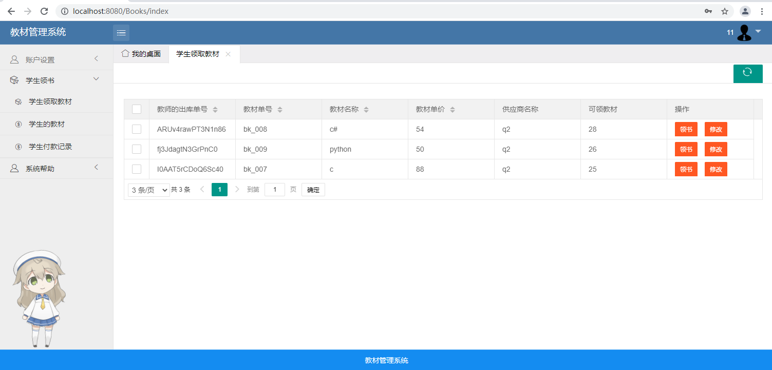 教师拥有:账户信息修改及用户密码修改、教材领用操作及查看领用记录